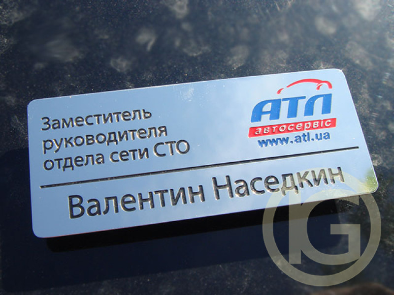 The image is transferred to the metal by etching. Text information, with the name printed on a self-adhesive, transparent film (arakal), then pasted in a specially provided, pressed through place in the badge. And when changing staff, you just have to replace this film with a new one.