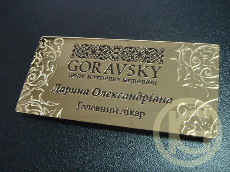 The required image and text information is transferred to metal badges by etching without the subsequent possibility of making changes in the finished product, in other words, a name badge.