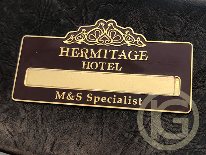 Or the second, the most common option is making badges for a removable name: the image is transferred to metal badges by etching. Text information with the name is printed on a self-adhesive, transparent film (arakal), then pasted into a specially provided, pressed-through place (window) in the badge. When changing staff, you just have to replace this film with a new one. The production of badges can be made in any size, but we can offer you the production of badges of standard sizes, the most common sizes when ordering metal badges: 65 * 30 mm, 70 * 25 mm, etc.
