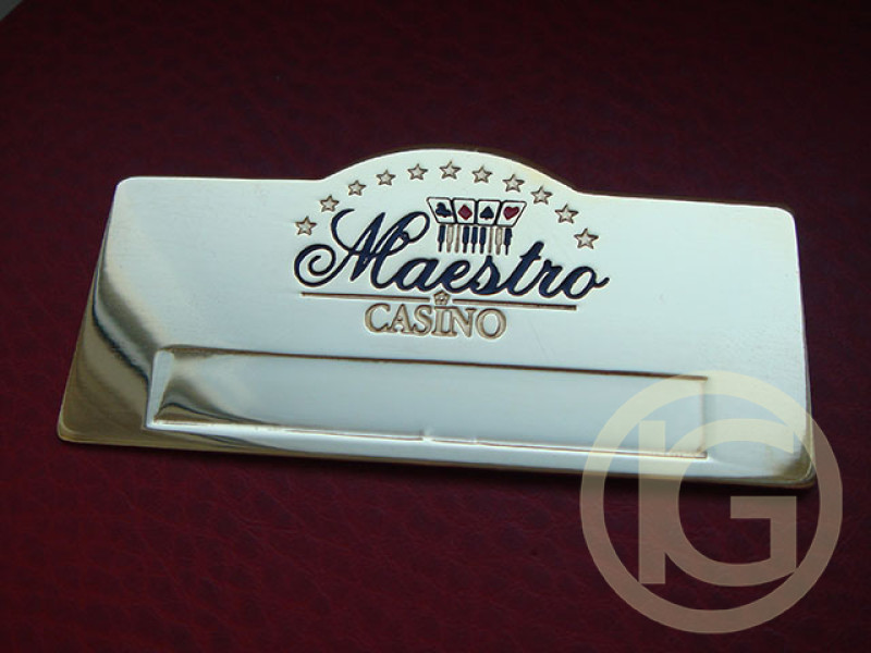 Figured metal badges with the logo "maestro" with a window for the name under the replaceable arakal. Production of badges is made by metal etching under the order.