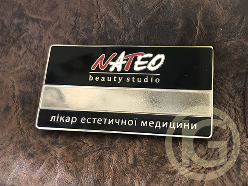 Production of metal badges with the logo "nateo" and position, custom-made metal etching.