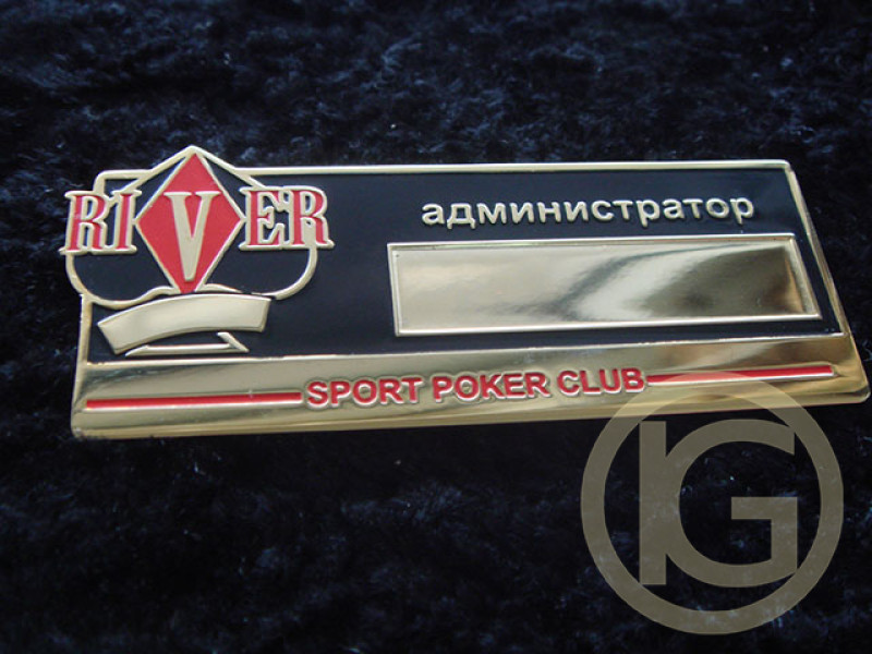 Badges for the staff of the sports poker club "River", made of metal, individually under the order. The method of manufacturing badges is metal etching.