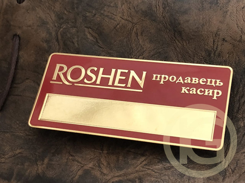 Metal badges with a position of a network of shops "Roshen", manufacturing is performed by the method of metal etching.