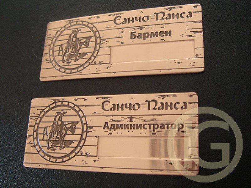 The image is transferred to the metal by etching. Text information, with the name printed on a self-adhesive, transparent film (arakal), then pasted in a specially provided, pressed through place in the badge. And when changing staff, you just have to replace this film with a new one.