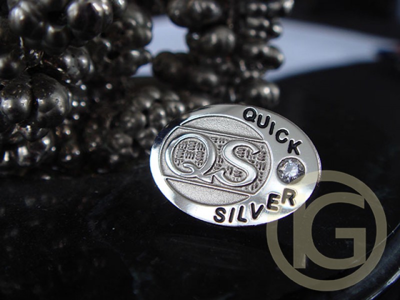 Production of corporate pins with the "qs" logo, with an insert of Swarovski crystals, made by chemical etching