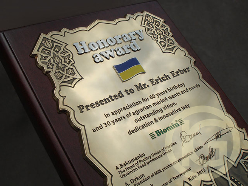 Production of the award diploma "Honorary Award Biomin", performed by milling the metal, with the invoice milled letters, flag. Plaque made of natural wood.