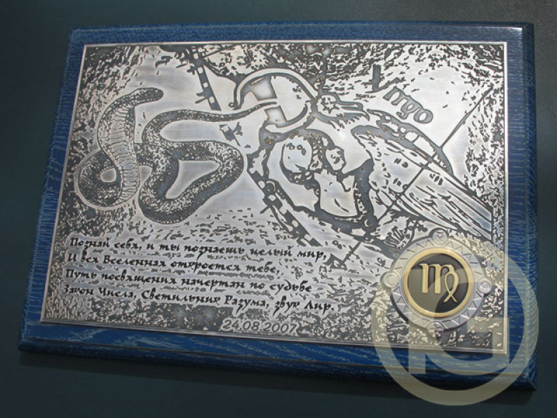 Congratulatory diploma on the birthday of "virgo", depicting the constellation of the Virgo, the snake, the symbol of the year of birth according to the eastern calendar, decorated with Swarovski crystals ... The diploma is made into 3 metal parts by engraving - by etching the metal. Substrate diploma made of natural wood with an individual color to order ...