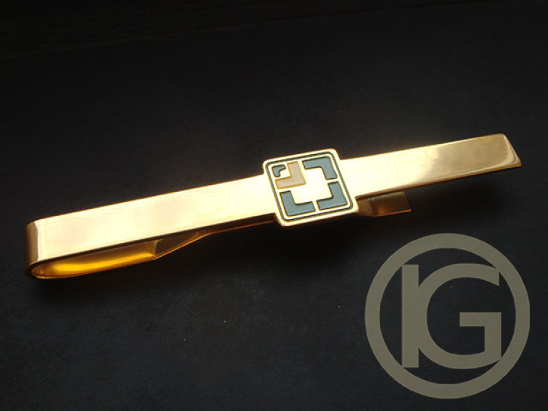 Corporate tie clips with a logo, a method of making clips for a tie, metal etching, decorative gold plating by electroplating, color with colored enamels ...