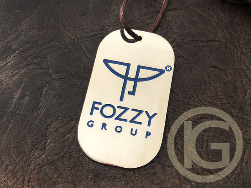 Metal wearable tokens on a ball chain "fozzy group", made by metal etching, decorative coating nickel, colored with colored enamels, fastening the token - a ball chain.