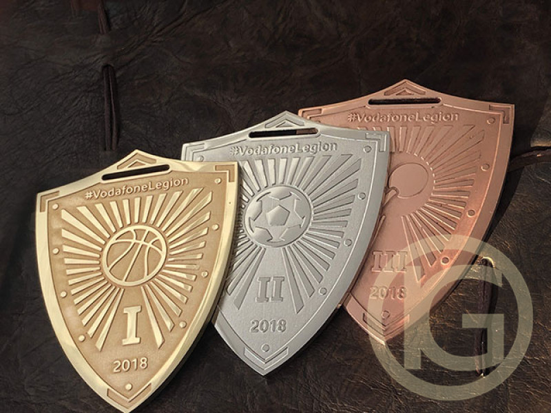 Award medals with figured clipping "Vodafone Legion". The production of medals is carried out by the method of making medals. Two-sided etching and milling of metal.