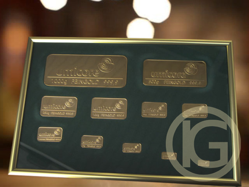 Plaster casts of gold bars "umicore", made by etching, coated gold. Plaster casts are equipped in gold gold frame, with velvet flock.