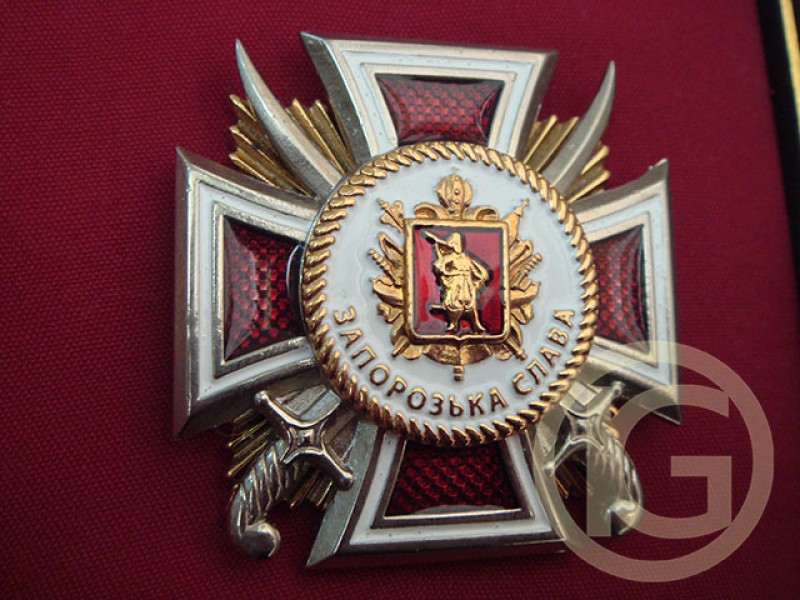 Breastplate, order "Zaporizhzhya glory". The production of signs, orders is made by stamping in 3 parts, nickel, gold coating, color of the insignia with colored enamels and varnishes. Fastening reward spin.