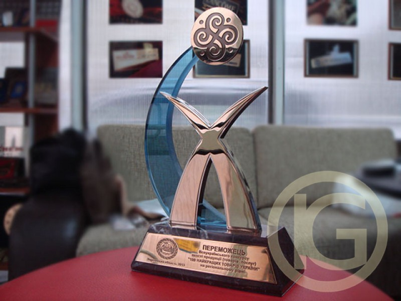 Prizes from metal on the basis of glass, stone 100 best goods of Ukraine. Production of prizes - awards, performed by milling and etching of metal, using an element of French blue glass. Pedestal - - natural stone (Imperador). The metal used decorative coatings gold, nickel, color enamels and varnishes.