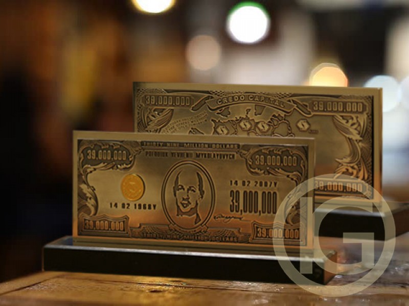 VIP gift - a reward - a souvenir made of metal. Money bill of 39,000,000 credo capital. The order was made by the method of metal etching, decorative coating silver with blackening, gold. Stand - natural stone (black absolute).