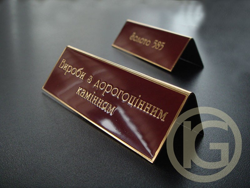 Production enterprise Image Grad offers two options for the manufacture of desktop plates: a metal plate with information is mounted on a stand made of natural wood in the shape of a triangle. Metal plate, depending on the size and the desired result, bends under 45-90 degrees for stability on the table. Production of desktop plates on individual layouts, using modern technology of manufacturing plates: the manufacture of plates by the method of etching, milling. Only high-quality materials, advanced technologies and coatings are used in the manufacture of plates, which allow you to personalize the plates, produce high-quality plates in the shortest possible time and at the best price.