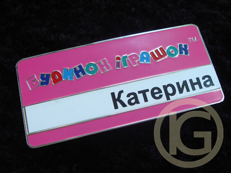 Изготовление металлических бейджей с окрасом цветными эмалями, с окном под сменный аракал с именем, выполнено под заказ методом травления металла