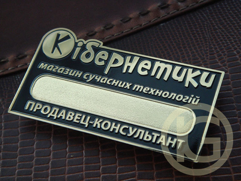 Изготовление бейджей для персонала с логотипом "Кибернетики", должностью, окошком для имени под сменный аракал, выполнено методом производства металлических бейджей - травление.