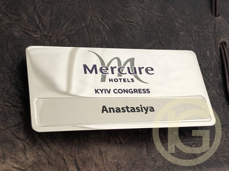 Заказ на изготовление бейджей с логотипом "mercure" с окошком для имени, выполнен методом травление металла.