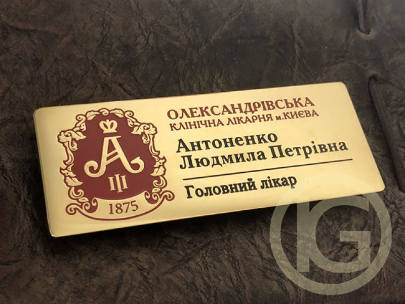 Металлический именной бейдж с должностью главный врач и логотипом "Александровская клиническая больница", метод изготовление бейджей травление металла.