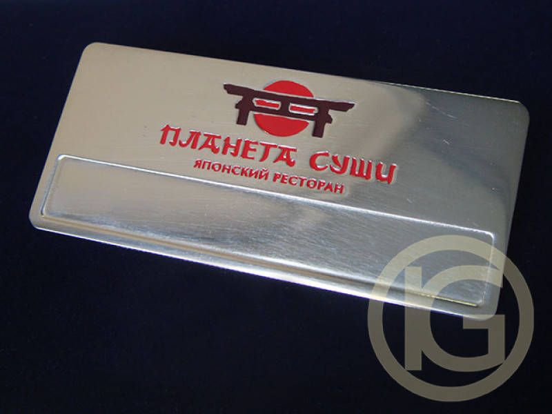 Бейджи для персонала ресторана "планета суши", бейджи с логотипом и окошком для имени, метод изготовление бейджей - травление.