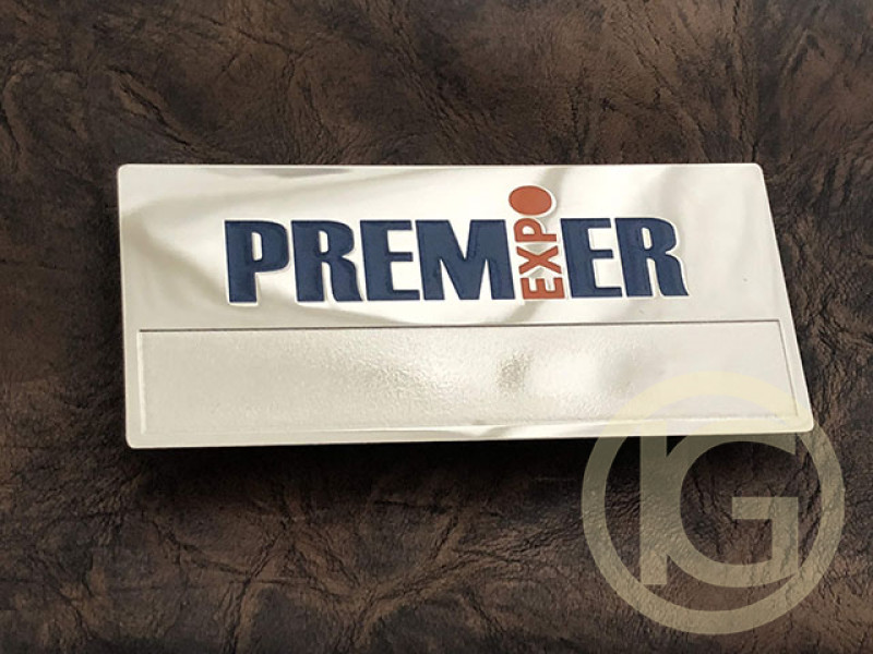 Производство фирменных бейджей с логотипом "Premier Expo" с оном для имени на аракале. Изготовление бейджей выполнено методом травление металла под заказ.