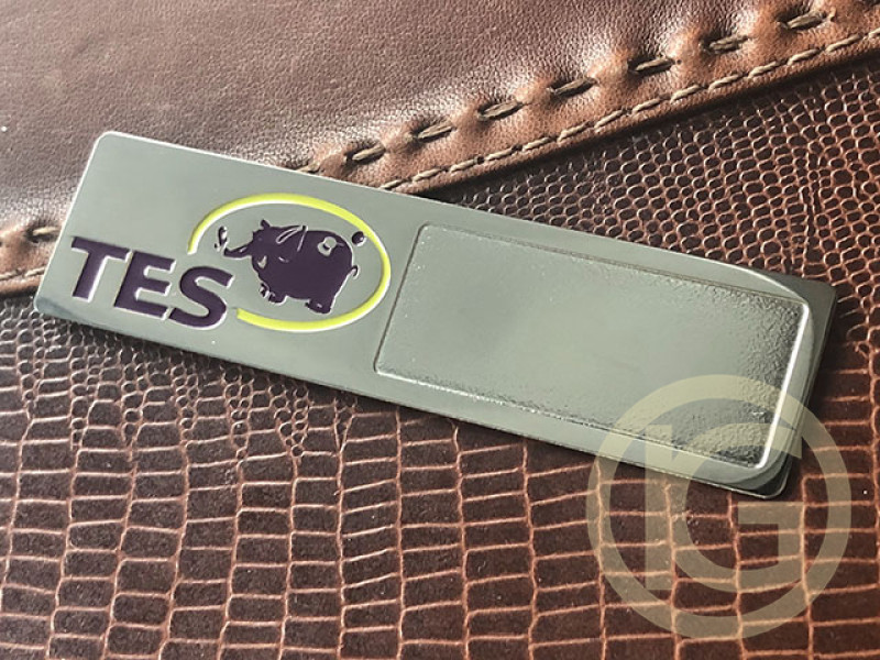 Изготовление металлических бейджиков с логотипом сети АЗС "tes" и окошком для замены имени, выполнены методом производства бейджей из металла - травление.