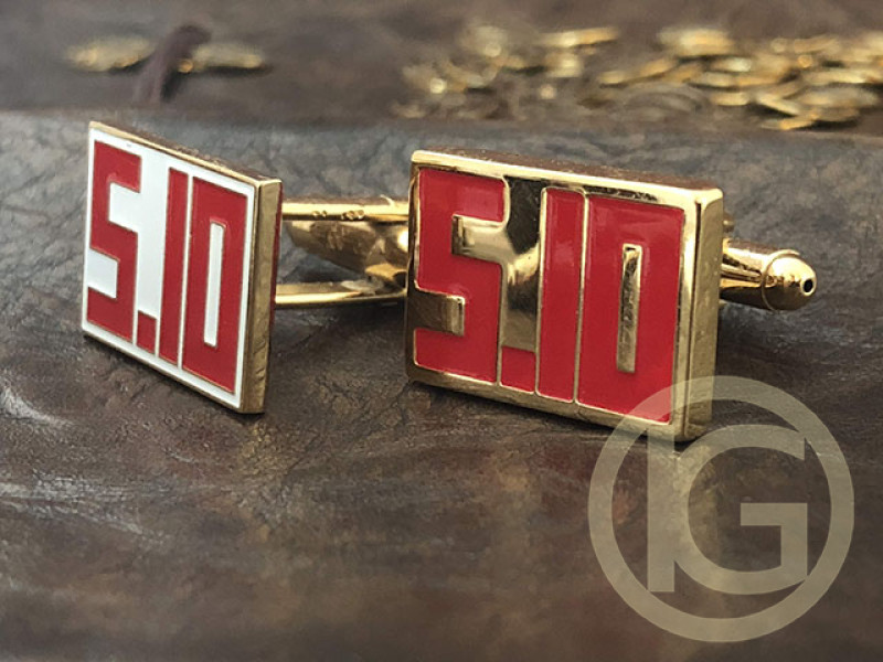 Латунные запонки "5.10", изготовление выполнено на заказ методом травление металла, декоративное покрытие золото, окрас цветными эмалями.