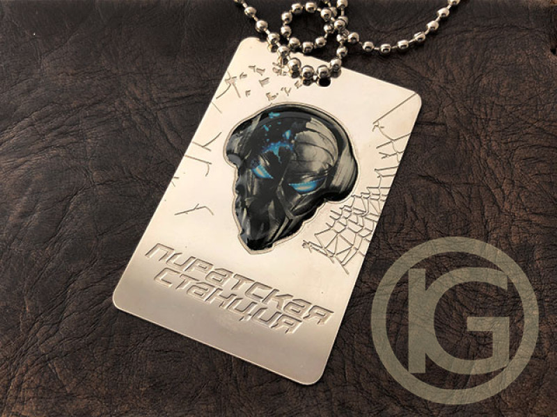 Латунные металлические нательные жетоны на шариковой цепочке "пиратская станция", изготовлены методом травления металла, декоративное покрытие никель, вклейка полноцветной шильды, крепление жетона - шариковая цепочка.