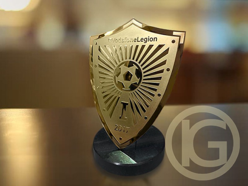 Металлическая награда – призы, победителям в спортивных состязаниях Vodafone Legion. Изготовление призов, выполнено методом травления и фрезеровки металла. Основа из природного камня (зеленый мрамор).