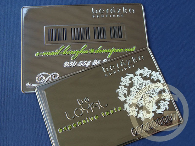 Металлические дисконтные карты с логотипом "berezka", выполнены из металла на заказ, методом двухстороннего травления.