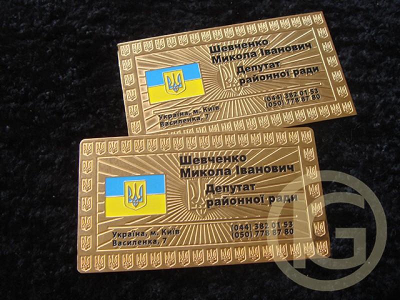 Визитные карточки из металла - металлические визитки (Business Cards of metal) - носитель контактной информации о человеке или организации. Визитки изготавливаются из металла латунь ( латунные металлические визитки). Изготовление визиток из металла включает: имя владельца, компанию (обычно с логотипом, эмблемой) и контактную информацию (адрес, телефонный номер, адрес электронной почты), слоган компании. Металлические визитки изготавливаются из хорошо полированного тонкого металла, обычно толщиной 0,5 мм с последующим гальваническим покрытием золотом или серебром, при необходимости окрасом эмалями продавленных элементов металлической визитки. Изготовление металлических визиток, индивидуальных VIP визиток, VIP карт из металла с Вашим лого на заказ в Киеве могут быть сделаны как с односторонним изображением (односторонние металлические визитки), так и с двух сторонним изображением (двух сторонние визитки из металла).