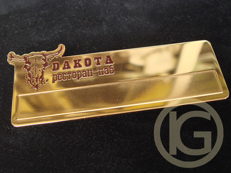 Виготовлення бейджів для персоналу ресторану "дакота" виконано з фігурною вирізкою по контуру логотипа, метод виробництва бейджів - травлення металу.