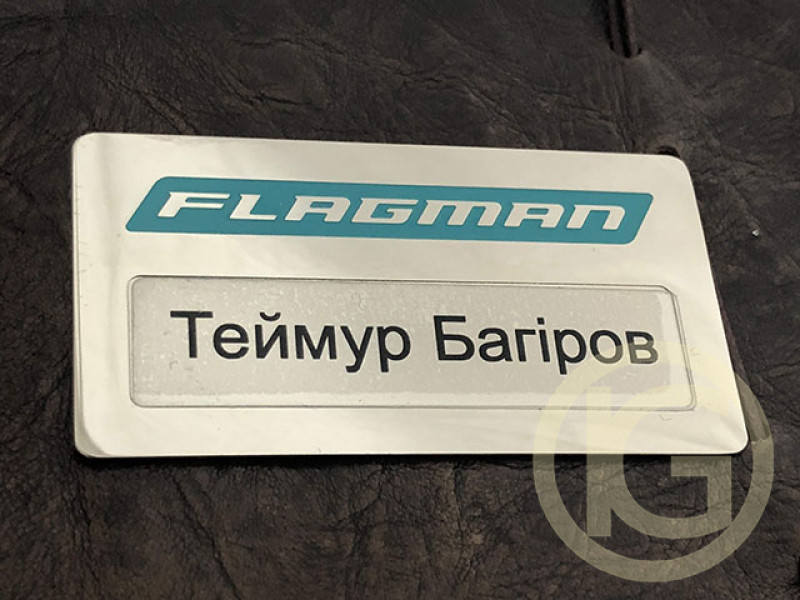 Латунні металеві бейджи з рельєфним зображенням логотипу "flagman", вікном для змінної інформації імені на аракале, виконані методом травлення металу