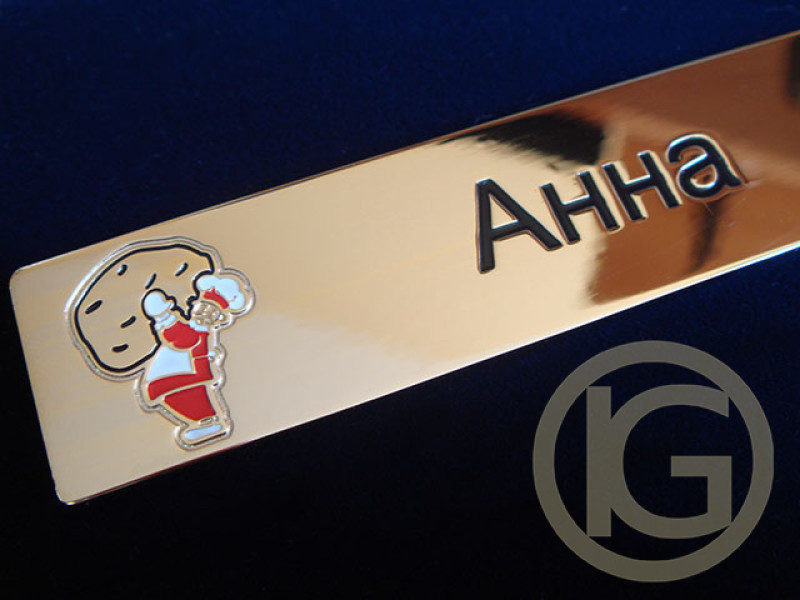 Потрібне зображення і текстова інформація переноситься на метал методом травлення без подальшої можливості внесення змін в готовому виробі, іншими словами іменний бейдж.