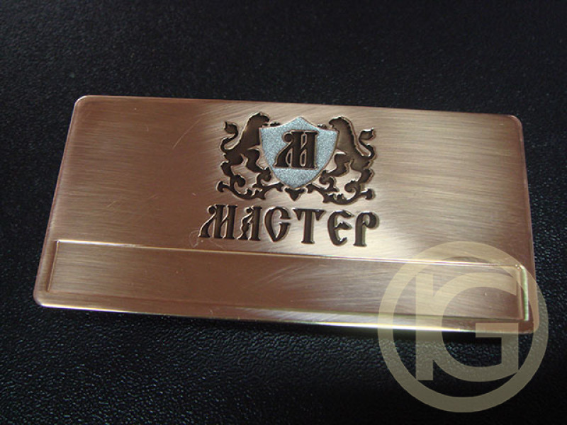 Потрібне зображення і текстова інформація переноситься на метал методом травлення без подальшої можливості внесення змін в готовому виробі, іншими словами іменний бейдж.