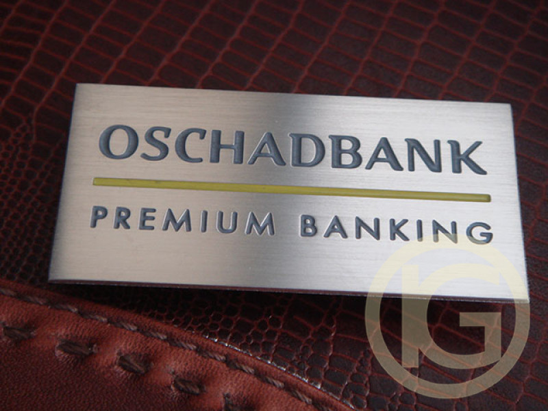 Корпоративні - фірмові бейджи з логотипом "oschadbank", виготовлення бейджів з металу на замовлення виконані методом травлення металу.