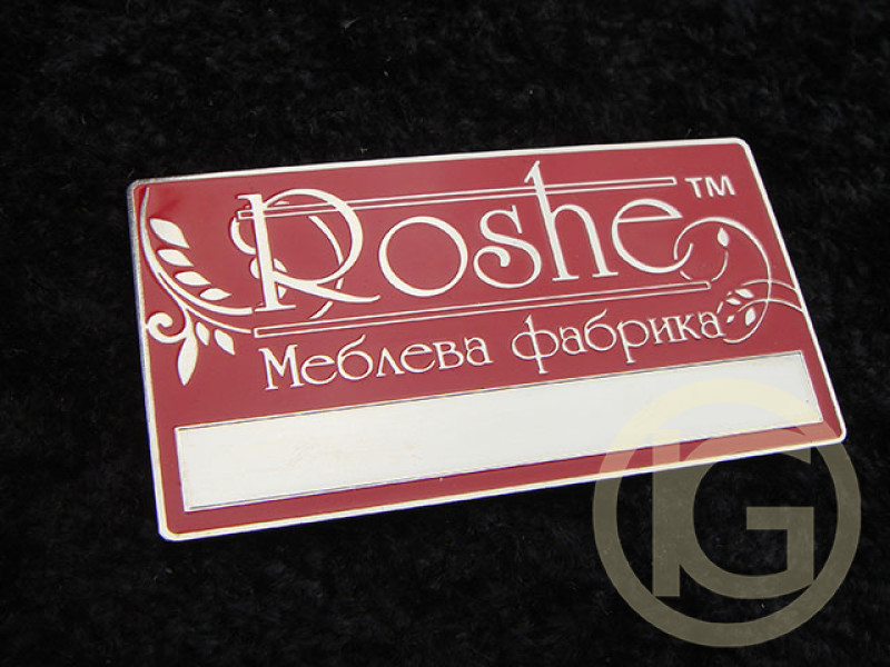 Виготовлення бейджиків з металу в корпоративному стилі з логотипом меблевої фабрики "Roshe", виконано на замовлення, метод виробництва бейджів - травлення металу.