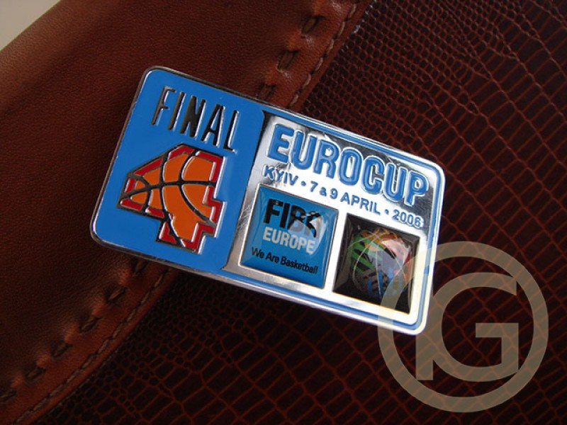 Пам'ятні нагрудні значки з логотипом "evrocup", виготовлені на замовлення з металу, метод виробництва значків - травлення з вклейкою смоляних шильд.