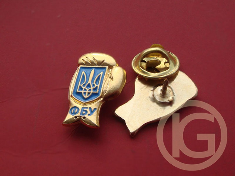 Значки в формі боксерської рукавички з логотипом Федерації Боксу України, виготовлені методом штампування металу.