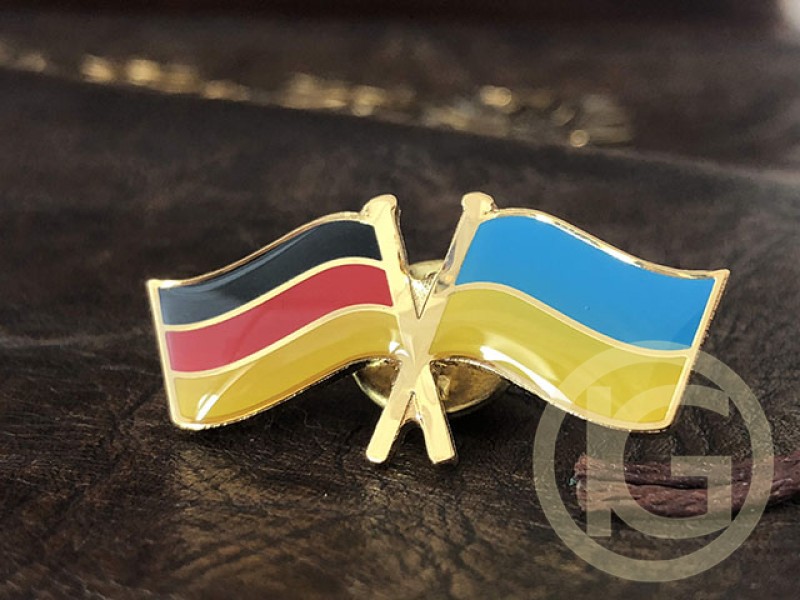 Металеві значки з полімером (смола - лінза) прапори країн, "прапор Німеччини та України", виготовлення значків на замовлення, виконане методом травлення