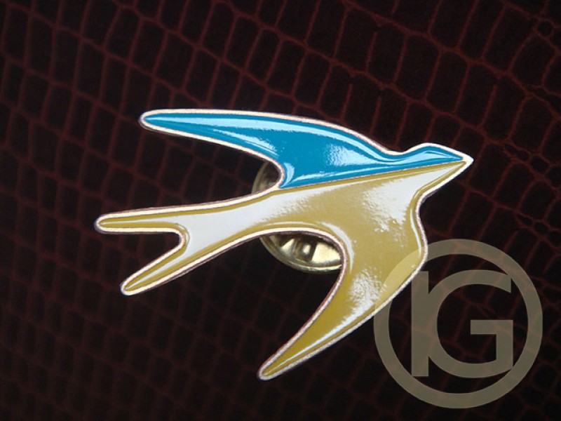 Значки в формі ластівки з забарвленням в колір прапора України, виготовлення значків виконано методом травлення металу.