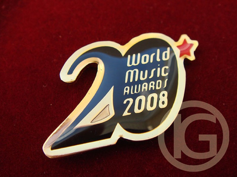 Нагрудні металеві значки "world music awards 2008", виготовлення значків виконане на замовлення методом травлення значків.