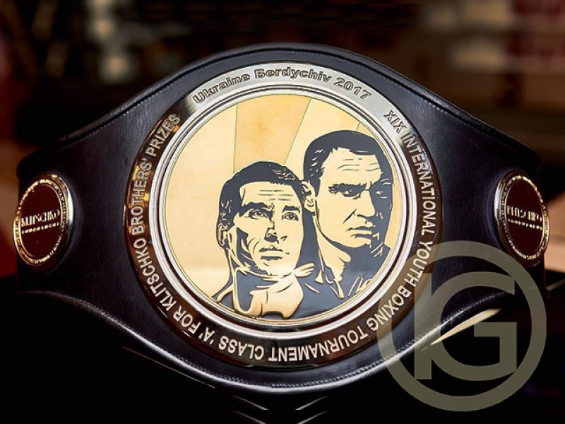 Чемпіонський пояс турніру з боксу "klitschko brothers prizes", виготовлений з високоякісної натуральної шкіри, металеві накладки пояса, виготовлені методом травлення металу, покриття золото, нікель забарвлення кольоровими емалями.