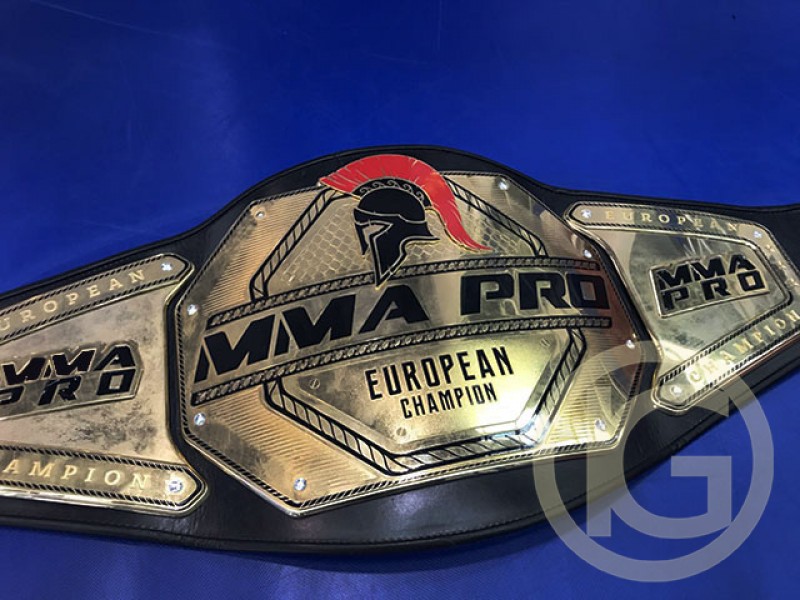Чемпіонський пояс MMA PRO, виготовлений з високоякісної натуральної шкіри, металеві накладки пояса, виготовлені методом травлення металу, покриття золото, окрас кольоровими емалями.