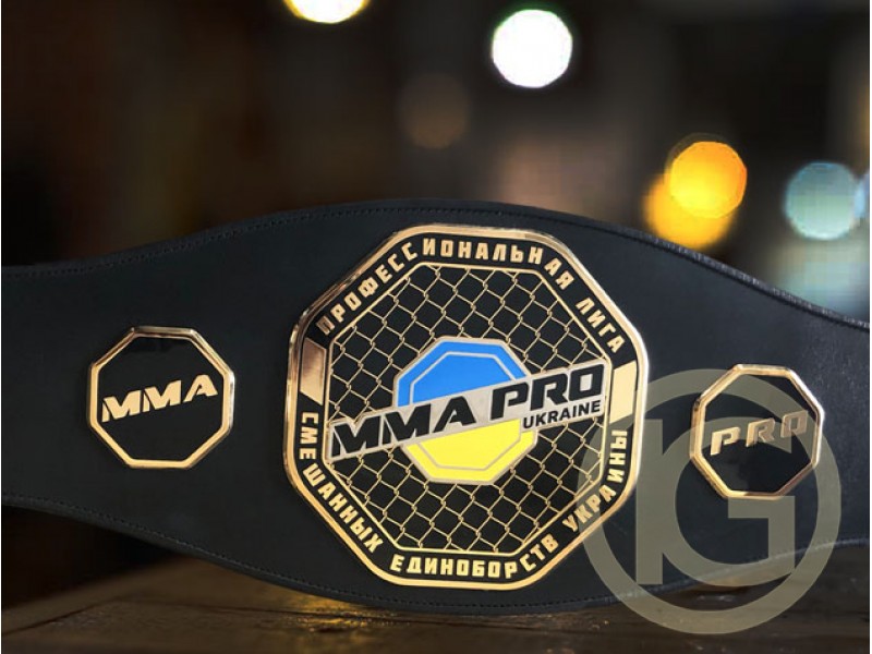 Пояс чемпіона mma pro ukraine, виготовлений з високоякісної натуральної шкіри, металеві накладки пояса, виготовлені методом травлення і фрезерування металу, покриття золото, нікель забарвлення кольоровими емалями.