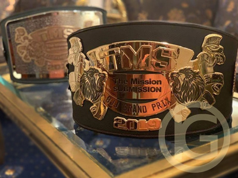 Чемпіонський пояс «tms bjj grand prix-2019». Пояс чемпіона, виготовлений з високоякісної натуральної шкіри, підкладка хутро - каракуль, металеві накладки пояса чемпіона, виконані методом травлення і фрезерування металу, покриття золото, окрас холодними лаками.