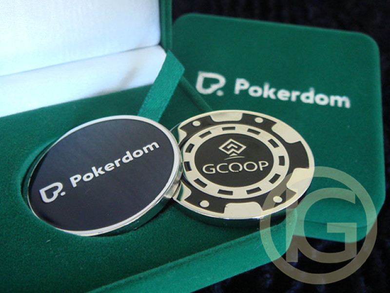 Кард-протектори "Pokerdom - серія турнірів GCOOP - Global Cup of Online Poker", в оксамитових футлярах для монет, з нанесенням логотипу. Виготовлення покерних фішок кард протекторв, виконано методом двостороннього травлення металу.