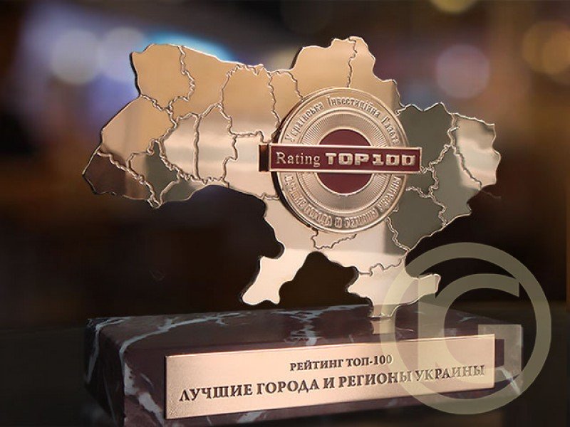 Приз - нагорода Рейтинг ТОП 100 Лучшие города и регионы Украины, изготовлена по индивидуальному заказу. Метод виробництва призів - травлення, фрезерування металу, покриття золота, окрас кольоровими емалями. Постамент - натуральний камінь (Россо Леванто).
