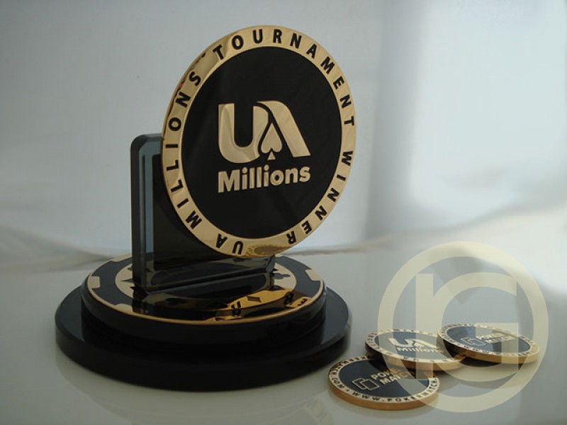 Нагороди зі скла і металу "ua-millions" для переможців турніру PokerMatch Million. Виготовлення нагород, призів, виконано з графітового скла з металевими накладками в покритті золото, забарвленням кольоровою емаллю. Метод нанесення зображення на металеві шильди - травлення металу.