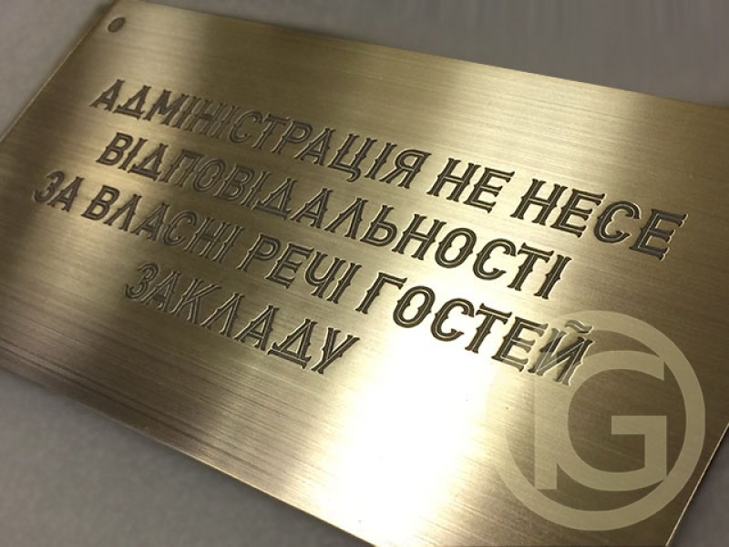 Таблички, вивіски з латуні (brass plates, sign of brass) - це класика часу, таблички мають виражений рельєф, краю зображуваних символів рівні й чіткі, головна відмінність латунної таблички привабливий золотий відлив.